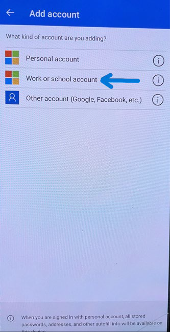 On the mobile App, select Work or school account
